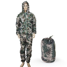 These suits are designed for hunting. They're lighter in weight than sniper ghillie suits and can be more breathable, and features 3D leaf-like Camouflage. This type of ghillie is sometimes used for Bird Watching or Wildlife photography.
