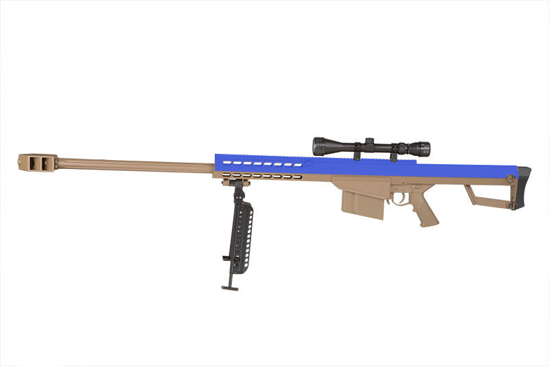 This airsoft sniper rifle is a clone of the Barrett M82A1, and this one comes in awesome two tone Tan and blue colours.