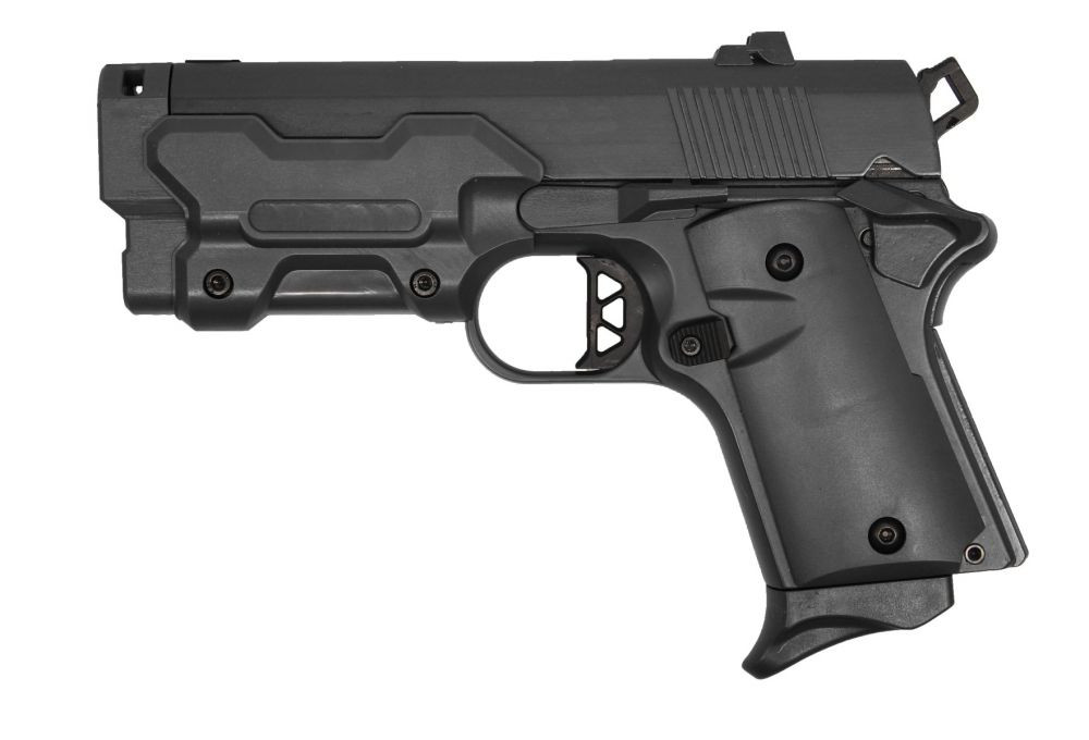 Despite its compact form, the pistol keeps all the important features: open iron sights, a slide lock on empty, textured mag release, and a 1911-style thumb safety system. It fires in semi-auto only, and it’s powered by green gas via the included 18-round metal magazine. The mag base plate is also stylised and flared—true to the anime look but also very practical when under pressure mid-game.