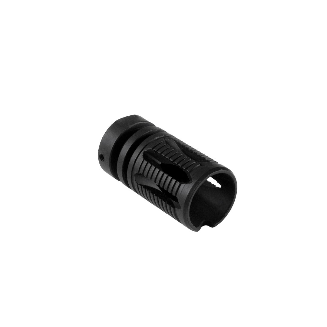 - Short cage style flash hider for airsoft rifles